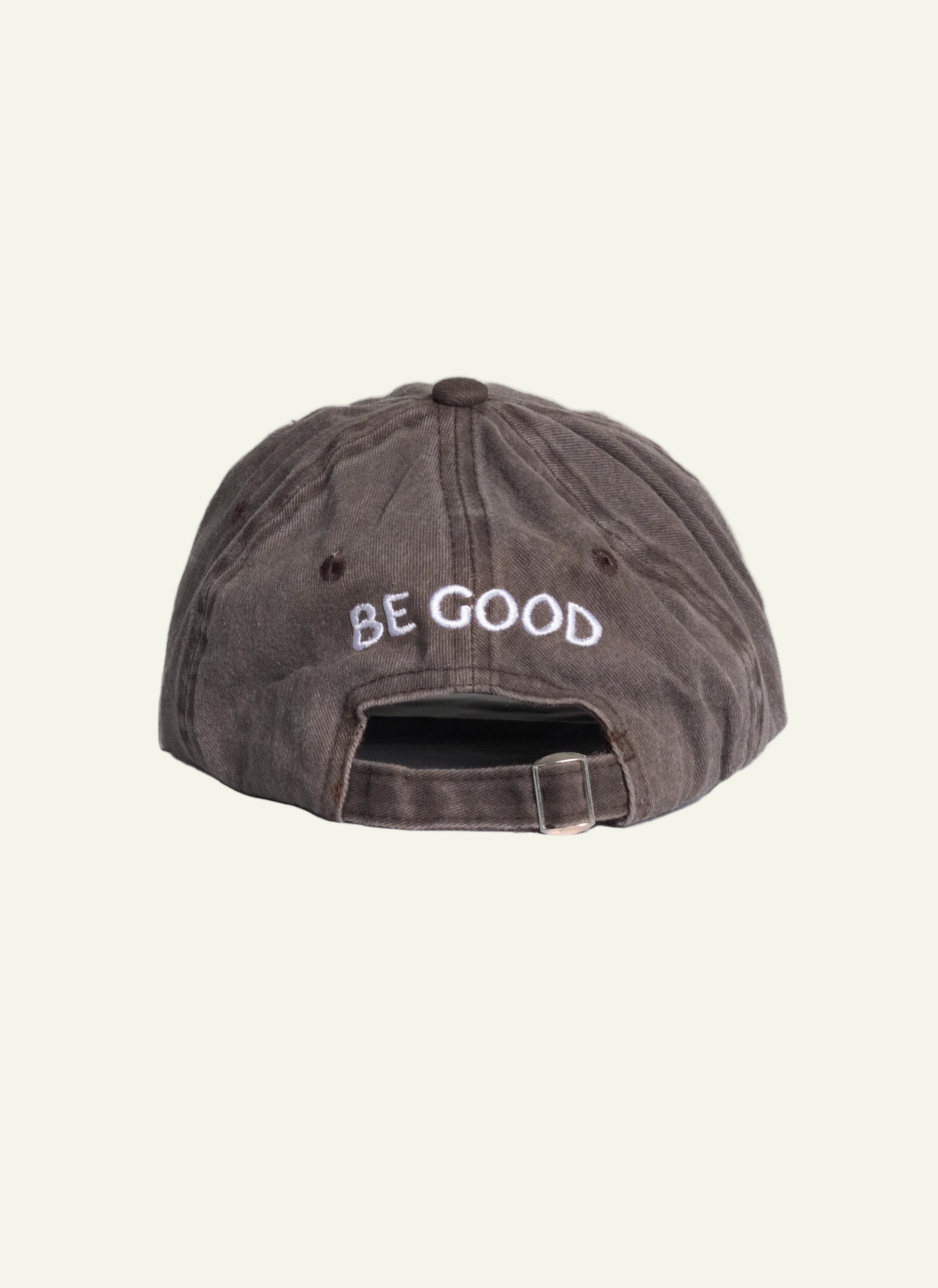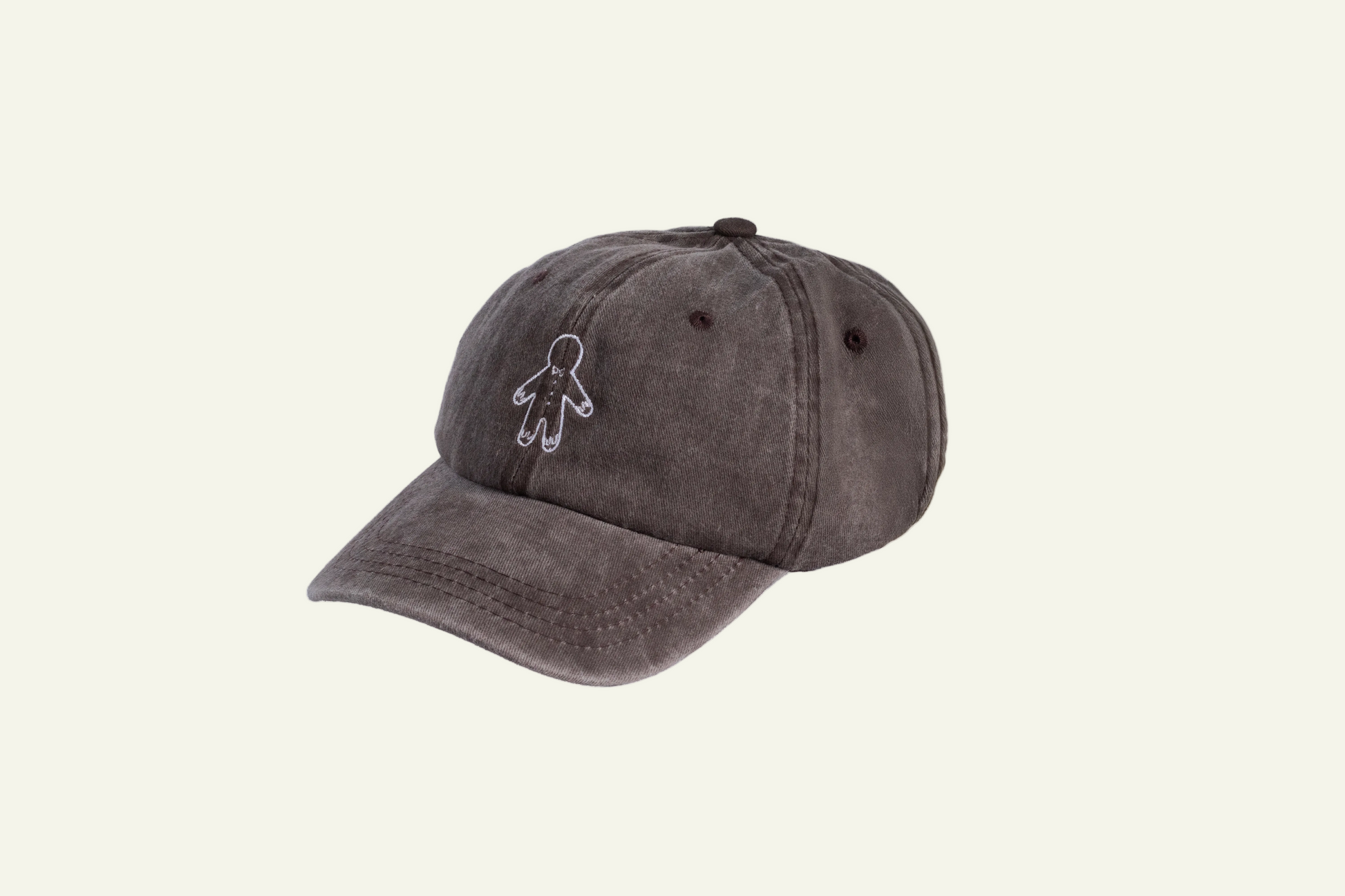brown washed cotton cap, featuring a white gingerbread man embroidery. The washed finish gives it a vintage look, while the adjustable strap ensures all-day comfort